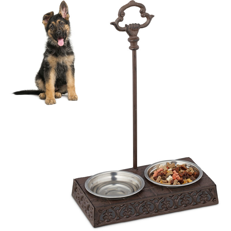 Relaxdays Comedero Perro Doble, Soporte con Asa, 2 Cuencos, Hierro Fundido-Acero Inoxidable, 200 ml, 1 Ud, Marrón Oscuro