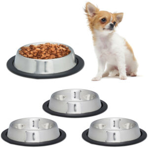Set 4 Comederos de Perro, Tamaño S, Cuencos Agua y Comida, Antideslizantes, Acero Inoxidable 200 ml, Plateado