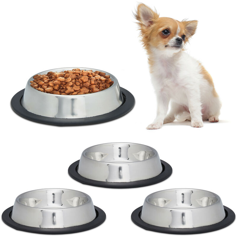 Set 4 Comederos de Perro, Tamaño m, Cuencos Agua y Comida, Antideslizantes, Acero Inoxidable 0,5L, Plateado