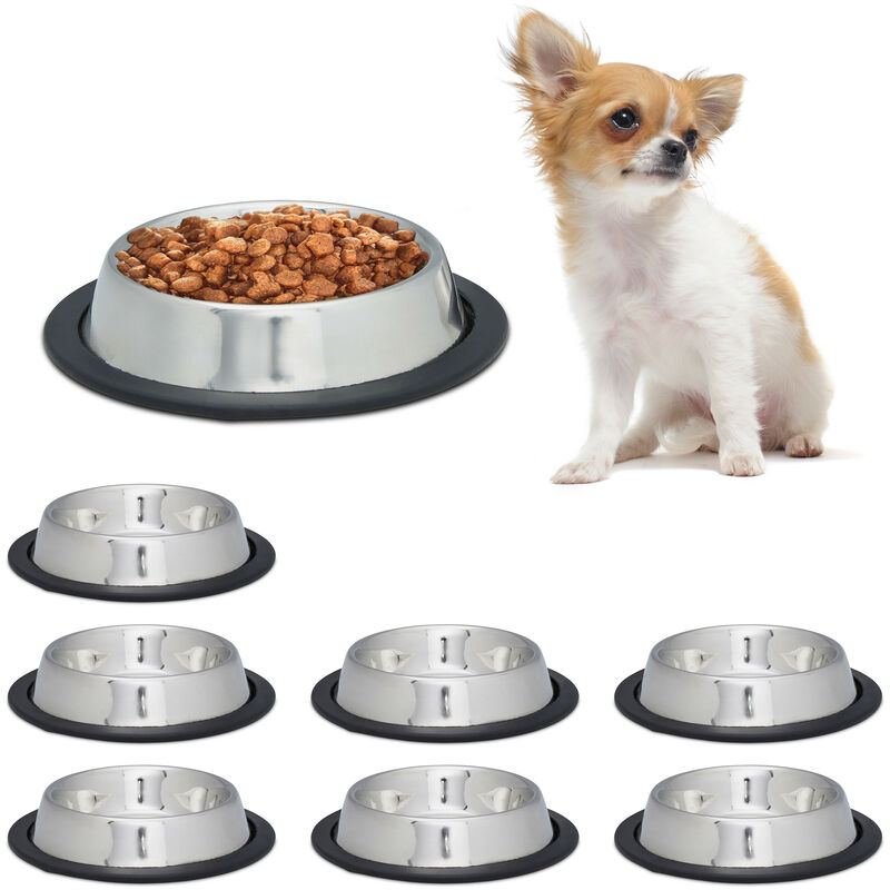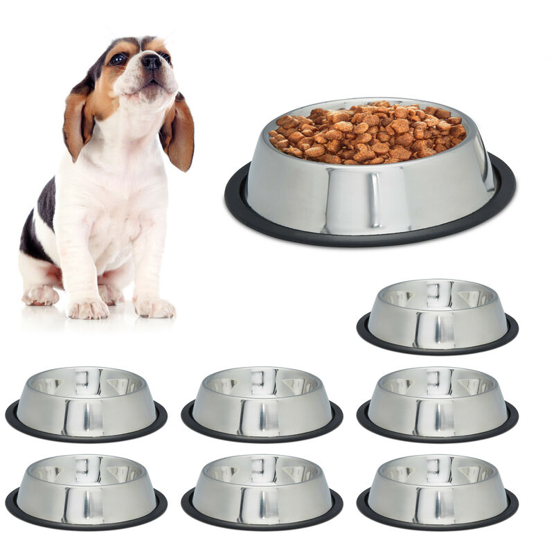 Set 8 Comederos de Perro, Tamaño M, Cuencos Agua y Comida, Antideslizantes, Acero Inoxidable 0,5L, Plateado