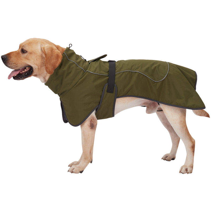 Puede que estés listo para el clima frío, ¿verdad? Pero, ¿qué pasa con tus lindos amigos? Si tienes miedo de que se enfríe afuera, aquí tienes un abrigo con diseño polar, impermeable y reflectante. ¡Tu mascota se sentirá cálida y tendrá menos restricciones! Característica: El suave forro polar interior y el cuello alto ajustable se sienten cómodos y mantienen a su perro abrigado en invierno. Las tiras reflectantes hacen que su perro sea más visible y seguro por la noche. Tejido impermeable, no se preocupe por la nieve y la lluvia. Un orificio para la correa, conveniente para pasear al perro. El cinturón ajustable con hebilla de liberación rápida para perros de diferentes tamaños y fácil de poner / quitar. Dos correas traseras para las patas traseras para la estabilidad del abrigo. Especificaciones: Tamaño: XS / S / M / L / XL / 2XL (opcional) Color: negro / verde militar (opcional) Material: poliéster, nailon Peso del artículo: Aprox. 190-362g / 6,7-12,8 oz Detalle de tamaño: Tamaño