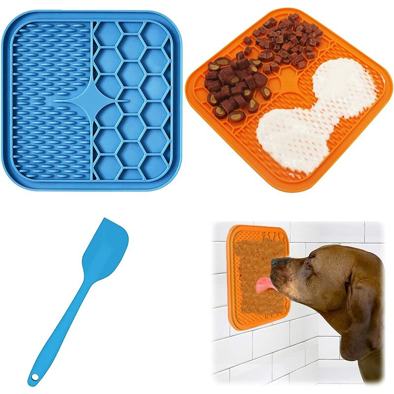 ?Silicona de grado alimenticio?Nuestro tapete para lamer para perros está hecho de silicona de grado alimenticio de alta calidad y no habrá residuos que dañen a su mascota. Material de silicona, saludable, seguro, duradero, sin BPA, flexible, flexible y no deformable. ?Diseño único? La alfombrilla para lamer perros se divide en un área para lamer y un área para comida lenta, adecuada para varios refrigerios y alimentos como yogur, hígado e intestinos. Puede hacer bricolaje libremente para preparar refrigerios para mascotas de diferentes sabores, medio recubiertos y medio llenos con los refrigerios favoritos de las mascotas, para que sus mascotas puedan disfrutar de deliciosas comidas. ?Fácil de usar? Solo use untar los alimentos favoritos de su mascota, como la mantequilla de maní , mantequilla y refrigerios en el tapete, luego péguelo en cualquier superficie lisa, como paredes de baños, azulejos, metal, vidrio y mármol, evitando que se caiga de la pared o se mueva en el piso. Séquelo