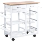 Este carrito organizador es compacto e ideal para espacios pequeños que necesitan más almacenamiento. Tiene 3 cajones, 3 cestas de alambre y 2 estantes abiertos. También 2 prácticos estantes para especias mejoran las capacidades de almacenamiento y una barra para colgar los trapos de cocina. Gracias a sus ruedas giratorias, se puede transportar a cualquier habitación de la casa. Junto al contraste en color madera de la encimera, hacen un mueble apto para la mayoría de los estilos de decoración. Características: 3 cajones, 3 cestas, 2 estantes grandes, 1 barra y 2 estantes para especias, múltiples áreas de almacenamiento para artículos y suministros de cocina Fabricado con estructura de madera de pino y tablero de MDF de grado E1 4 ruedas giratorias suaves Carrito blanco con superficie de madera, perfecto para la mayoría de los estilos de decoración Estructura compacta con ruedas flexibles, adecuada para diversas ocasiones, especialmente cocina o comedor Especificaciones: