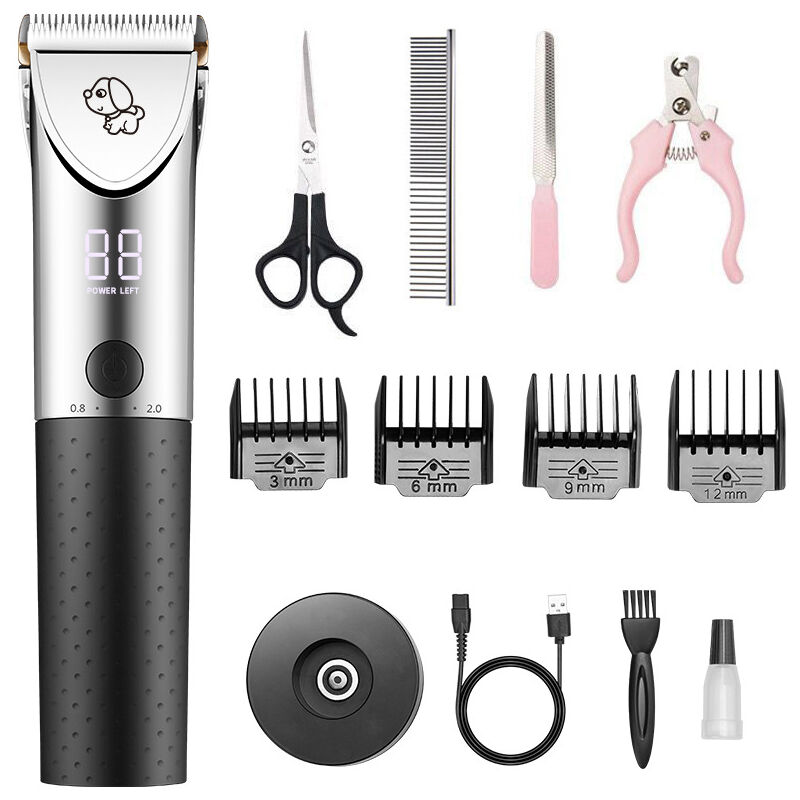 Recortador todo en uno para estilizar el rostro, la cabeza y el cuerpo: 13 piezas para todas sus necesidades de recorte Pantalla LCD Cortapelos para mascotas Cortapelos Suministros para mascotas para perros y gatos Afeitadora recargable para mascotas Nuestro exclusivo protector de corte estÿ reforzado con material de fibra de vidrio extra fuerte para evitar que se doble y pandeo, asegurando un corte uniforme cada vez; Material de la hoja: Acero La batera de iones de litio brinda 3 horas de funcionamiento inalÿmbrico, o se puede usar mientras estÿ enchufada para un uso continuo. Incluye: Como se muestra