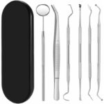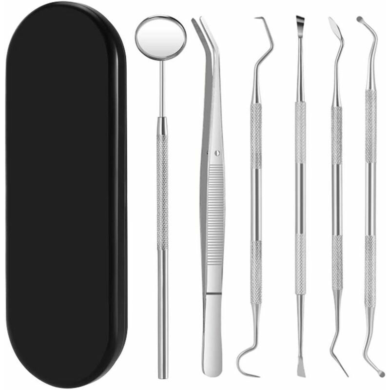 Material: acero inoxidable Plata Dimensiones: espejo dental: 16 cm, pinzas: 15,5 cm, sonda: 16,5 cm, dispositivo de detección dental: 17 cm, dispositivo de limpieza en forma de gancho: 16,5 cm. Limpiador en forma de hoz: 15,5 cm Alcance de la entrega: 6 * instrumentos dentales ?Juego de cuidado dental?- Equipado con 6 tipos de accesorios. Mantenga los dientes blancos y elimine con cuidado todas las partículas de mucosidad dental que no se puedan eliminar con el cepillado y el hilo dental diarios. Limpiar y evitarmal aliento. [Kit de limpieza de dientes]: con el uso regular del kit dental, los dientes se pueden limpiar de manera efectiva. [Material seguro y confiable]: este producto está hecho de acero inoxidable 304 seleccionado sin recubrimiento superficial. El mango antideslizante y fácil de usar garantiza un agarre firme y seguro. [Usado ampliamente]: esta herramienta se puede usar no solo como una herramienta de aseo personal, sino también para sus propias mascotas. Puede mantener