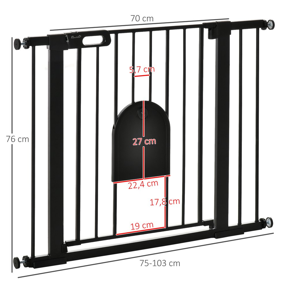 Si tienes mascotas en casa y quieres limitar el espacio o protegerlas de las escaleras; esta barrera para mascotas PawHut es ideal.Tiene una puerta con cerradura con sistema de cierre automático y una pequeña puerta para facilitar el paso de las mascotas de un lado al otro.Hecha de metal; tiene 4 tornillos de ajuste y 2 partes extensoras; para ajustarse a espacios entre 75 y 103 cm de ancho ¡Es ideal para familias con mascotas!Características:- Fácil acceso mediante pestillo de apertura en la parte superior; que se puede abrir con una sola mano.- Cuando el ángulo de apertura de la puerta sea inferior a 90°; se cerrará automáticamente al soltarla.- Estructura de acero para mayor resistencia y durabilidad.- Cierre inteligente para mayor comodidad.- Tiene 2 cerraduras en la parte inferior para determinar la dirección de apertura de la puerta.- Tiene una pequeña puerta para facilitar el acceso de tu mascota a través de ella.- Adaptable a diferentes anchos mediante tornillos de ajuste y extensión.- Ideal para hogar con mascotas y apto para puertas; pasillos; escaleras; etc.- Requiere montaje.- NOTA:Esta barrera de seguridad solo es adecuada para aberturas de 75-103 cm; por favor; verificar las medidas antes de comprar este producto.Especificaciones:- Color:negro.- Material:acero y ABS.- Medidas totales sin extensión:70-82×76 cm (LxAL).- Medidas totales con extensión:82-103×76 cm (LxAL).- Ancho de entrada:60 cm.- Medidas de la entrada pequeña:19×17;8 cm (LxAL).- Distancia entre barrotes:5;7 cm.- Referencia:D06-110V01BK.