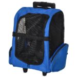 Este transportín para mascotas 2 en 1 de PawHut es la solución perfecta para llevar de paseo o de viaje a tu mascota.Se puede usar como carrito con ruedas o mochila para llevar colgada en la espalda.Con asa retráctil de acero y tela Oxford; es ideal para uso cuotidiano.Además; tiene 2 bolsillos para guardar los básicos para tu mascota.Gracias a el asa extensible y las 2 ruedas; podrás moverlo fácilmente a todos lados ¡Disfruta de las escapadas con tu mascota!.Características:- Su diseño 2 en 1; permite utilizarlo como carrito con ruedas o como mochila.- Con 2 ruedas de PU duraderas y 2 patas para facilitar su traslado y a la vez proporcionar estabilidad.- El asa retráctil de aleación de aluminio es ajustable en 2 posiciones.- Tejido de malla transpirable para una buena ventilación.- Tela Oxford 600D con revestimiento de PVC resistente al agua.- Viene con una correa de seguridad para llevar sujeta a tu mascota.- Fácil de manejar gracias a la puerta con cremallera en la parte delantera.- Nota:Verificar que tu mascota tenga espacio suficiente dentro de la mochila.Recomendable para mascotas con peso inferior a 4 kg.Especificaciones:- Color:azul.- Material:acero; tela Oxford y aleación de aluminio.- Medidas totales:42x25x55 cm (LxANxAL).- Medidas de la mochila principal:34x24x45 cm (LxANxAL).- Medidas de la puerta:26×41 cm (LxAL).- Medidas del bolsillo:21×19 cm (LxAL).- Altura del asa retráctil:74 cm; 96 cm.- Peso máximo recomendado:inferior a 4 kg.- Referencia:D00-136BU.