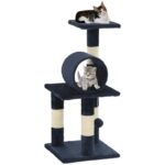 Descripción Con este rascador para gatos de alta calidad, sus gatos pueden rascarse, posarse, esconderse, trepar y relajarse. Se adapta a cualquier decoración. El rascador que araña al gato también le dará a los gatos la oportunidad de estirarse y hacer ejercicio, especialmente en los fríos meses de invierno cuando están en el interior. Los lujosos postes alfombrados están envueltos en una cuerda de sisal, que es muy cómoda y práctica para que su amigo felino afile sus garras. Su gato disfrutará persiguiéndose mientras salta hacia arriba y hacia abajo en este divertido centro de juego. Nuestro rascador de gatos está diseñado con una bola colgante, plataformas de observación y áreas de descanso para mantener a su amiguito entretenido. La base de rascador de gato es robusta y estable. Especificaciones: Color: Azul oscuro Material: Estructura de tablero de partículas + felpa suave + cuerda de sisal Altura del rascador de gato: 65 cm Dimensiones de la base: 30 x 30 m (longitud x anchura)