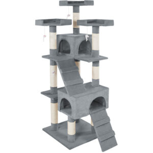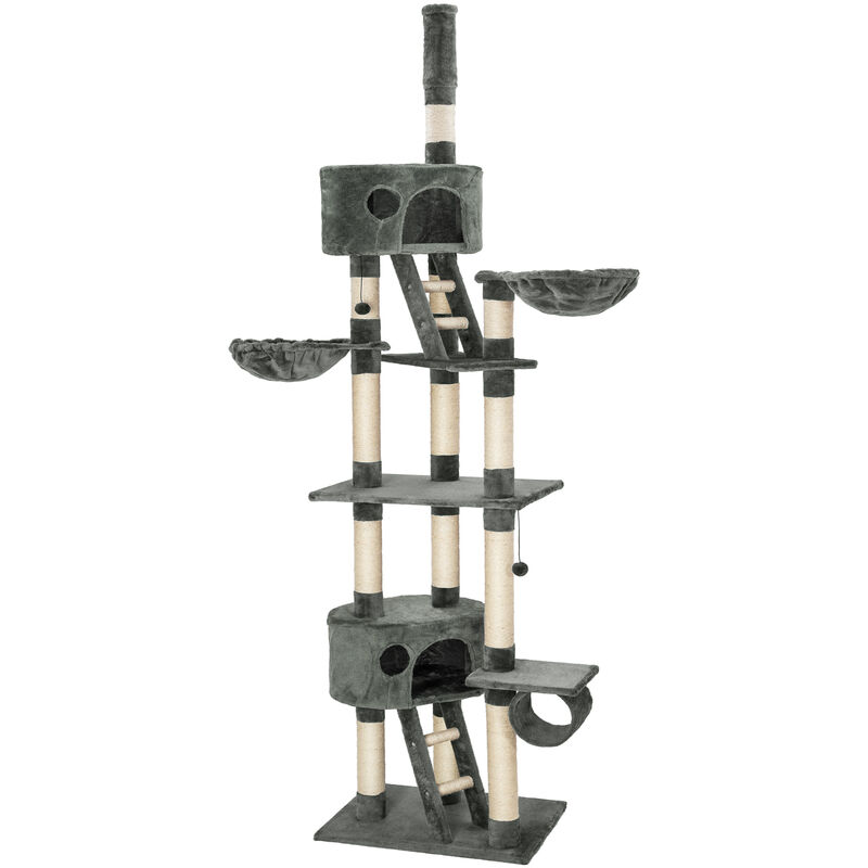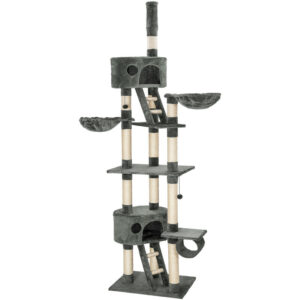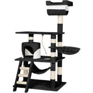 Su gato se enamorarÿ de este ÿrbol rascador. Ofrece opciones perfectas para jugar, afilarse las uÏas o como lugar de descanso. Con la escalera podrÿ subir a la caseta, que estÿ en el nivel 1. Justo a su lado hay una cuerda de juego. En el mismo nivel, hay un agujero a trav?s del cual se llega a una c½moda hamaca en la parte de abajo. Tiene ademÿs un nido donde tumbarse y en la parte superior, un cilindro para jugar justo debajo de la plataforma superior, desde donde podrÿ observarlo todo a 141cm de altura. En las resistentes columnas de sisal y felpa, su gato podrÿ afilarse las uÏas. Todo en un s½lo ÿrbol rascador compacto y resistente. Titulo Muchas posibilidades de juego y descanso Vistas excelentes Con hamaca para gatos Con cueva y cilindro El nido invita a tumbarse Incluye cuerda para jugar y escalera Combinaci½n resistente de sisal y felpa Plataforma superior a 141cm Firme y estable Protecci½n antivuelco para mÿxima seguridad Color: negro Detalles t?cnicos Medidas totales (largo