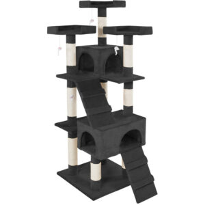 Su gato se enamorarÿ de este ÿrbol rascador. Ofrece opciones perfectas para jugar, afilarse las uÏas o como lugar de descanso. Con la escalera podrÿ subir a la caseta, que estÿ en el nivel 1. Justo a su lado hay una cuerda de juego. En el mismo nivel, hay un agujero a trav?s del cual se llega a una c½moda hamaca en la parte de abajo. Tiene ademÿs un nido donde tumbarse y en la parte superior, un cilindro para jugar justo debajo de la plataforma superior, desde donde podrÿ observarlo todo a 141cm de altura. En las resistentes columnas de sisal y felpa, su gato podrÿ afilarse las uÏas. Todo en un s½lo ÿrbol rascador compacto y resistente. Titulo Muchas posibilidades de juego y descanso Vistas excelentes Con hamaca para gatos Con una bonita cueva y un tubo El nido invita a tumbarse Incluye cuerda para jugar y escalera Combinaci½n resistente de sisal y felpa Plataforma superior a 141 cm Firme y estable Protecci½n antivuelco para mÿxima seguridad Color: negro/blanco Detalles t?cnicos
