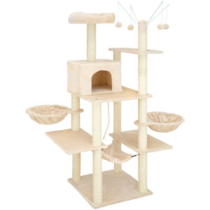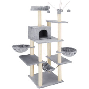 Atributo: ærbol para gatos simple y a la moda- Este ÿrbol de madera para gatos combina con el interior y con el exterior, crea una atm½sfera natural y es seguro y ecol½gico. El aspecto simple y a la moda combina con diferentes estilos decorativos de las casas y es muy prÿctico. Plataformas con 6 niveles y habitaci½n espaciosa– La curiosidad y las actividades de los gatos van hacia arriba. Para evitar que se hagan daÏo a causa de las grandes diferencias de altura en los saltos, realizamos plataformas de 6 niveles con intervalos uniformes. Ademÿs, creamos una habitaci½n espaciosa con cojn en tejido afelpado que protege la privacidad de las mascotas y les ofrece un espacio seguro en el que dormir. Revestimiento en tejido afelpado y columnas en cuerdas de sisal- Las garras de los gatos son blandas y delicadas. Para protegerlas de los rasguÏos, fijamos el tejido afelpado blando con el velcro en cada plataforma. Ademÿs, cada columna estÿ bien envuelta por cuerdas de sisal de alta calidad